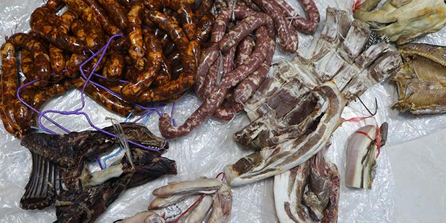 循着这辆摩托车展开追查,民警于近日在本市松江区抓获嫌疑男子刘某、胡某,并在刘某一辆轿车后备箱内发现了大量腌制肉类。