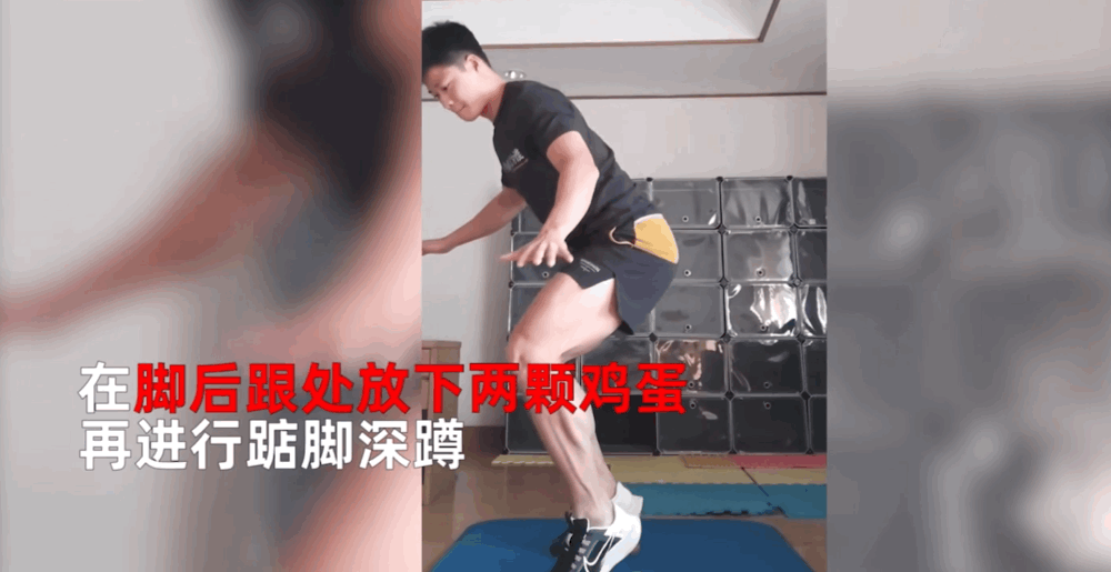 在脚后跟处各放置一枚鸡蛋,再进行踮脚深蹲,一套动作完成下来脚踝始终岿然不动。