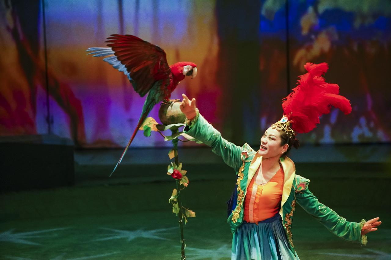 《欢乐马戏》则为观众带来了一幅人、动物与自然和谐共生的梦幻景象。小狗排排站推滚筒,鹦鹉骑车过桥聪明绝顶,老虎、鸽子、白马轮番上阵,小丑、杂技惊险绝伦,让观众连声叫好。