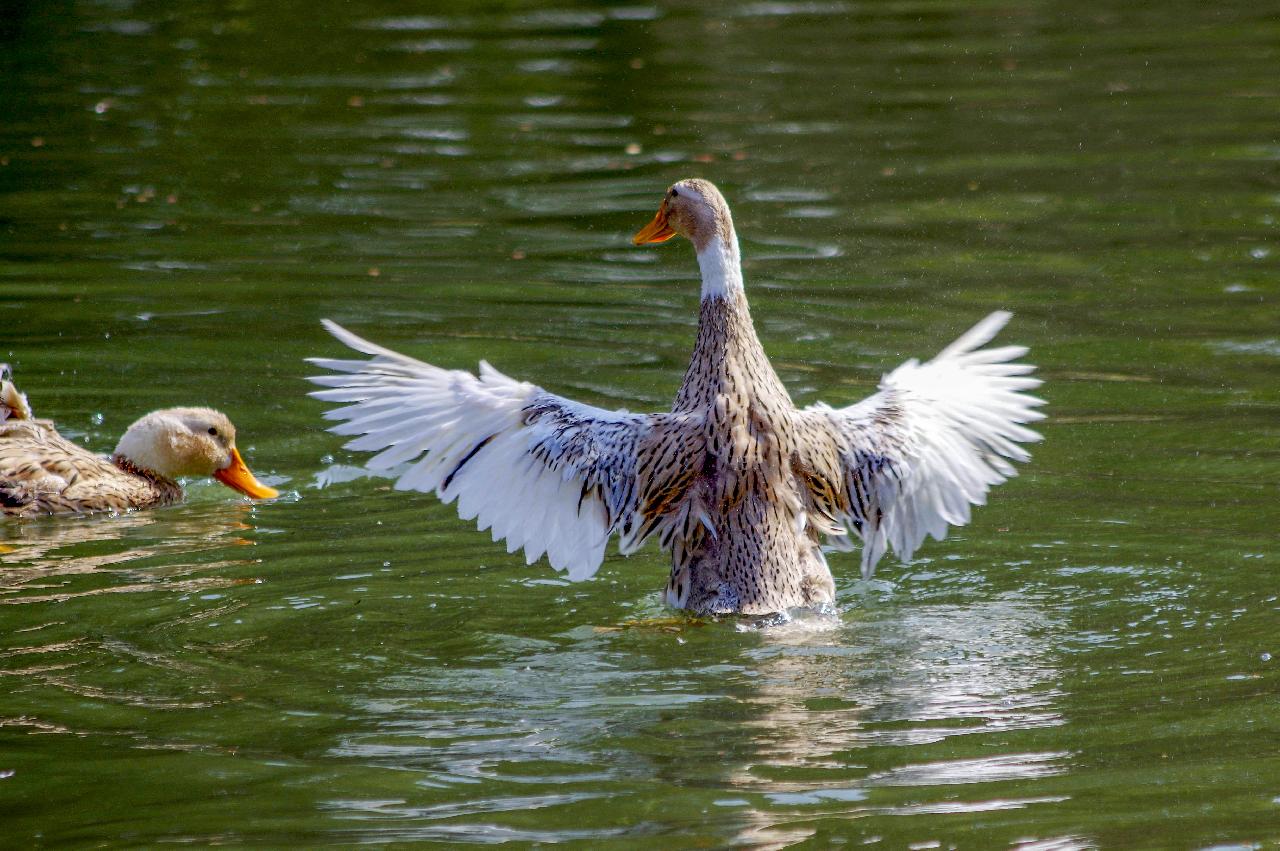 时而伸长脖子抖动翅膀,扬起水花阵阵,时而又静静地梳理羽毛……可爱的鸭群,绘就出灵动的清新画面,不禁让人想起“春江水暖鸭先知”的诗句。