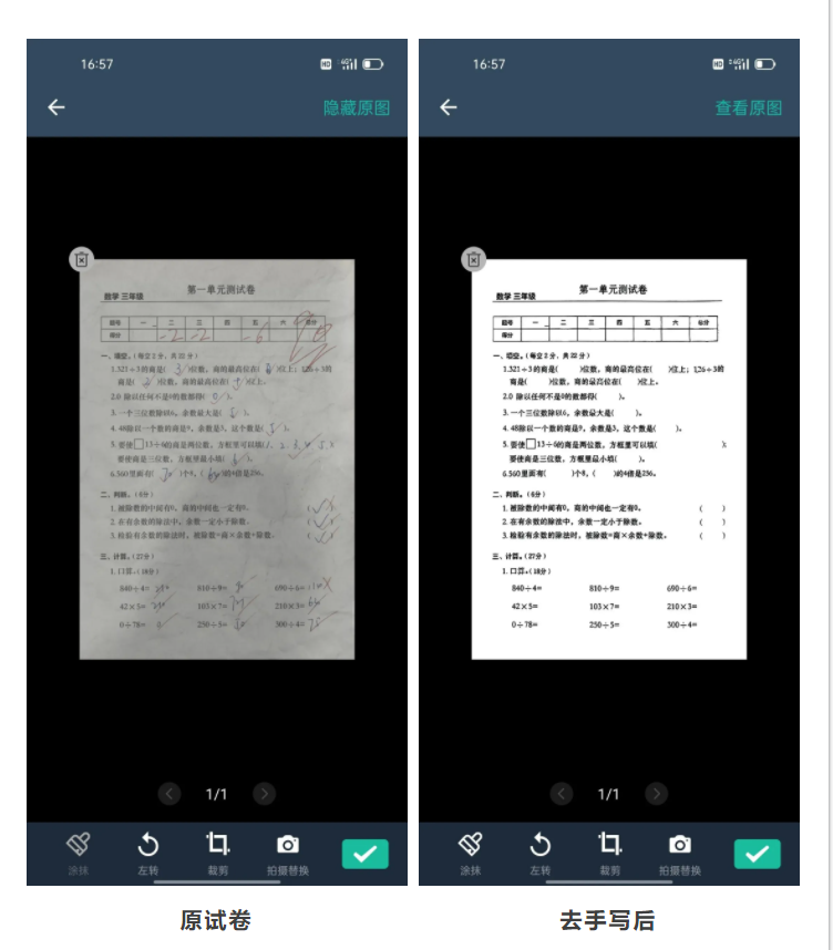 为保证线上教学高质量开展,让线上教学更智能,更有温度。扫描全能王推出了“试卷作业”功能,一键去除卷面上的手写字迹,还原空白试卷。