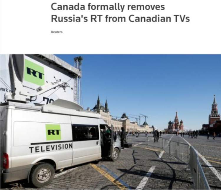 加拿大媒体监管机构广播电视及通讯委员会(CRTC)发布声明宣布:“RT的节目不符合加拿大衡量媒体服务的标准,也不符合《广播法》中设定的政策目标。CRTC还担忧来自外国的节目,这些节目试图破坏另一个国家的主权,贬低具有特定族裔背景的加拿大人,并破坏加拿大境内的民主制度。”