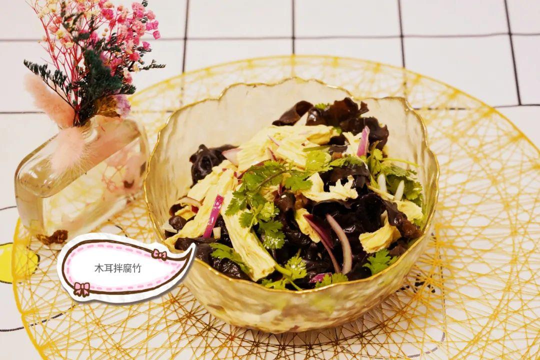 将木耳、腐竹焯水约1分钟,捞出来过凉并沥干水分。