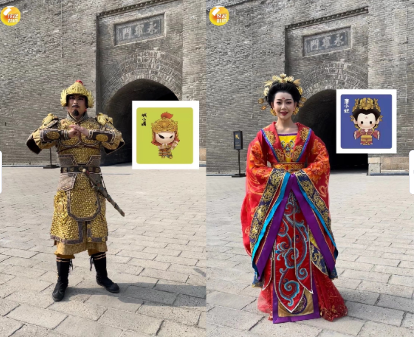 “城小将”其原型出自西安城墙景区文化演出《梦长安》的金甲武士;“唐小妃”原型是“唐贵妃”,依据西安城墙文化实景演出《梦长安—大唐迎宾盛礼》中的演出人设“唐代诸多含武则天在内的皇帝、贵妃女士”而来。↓