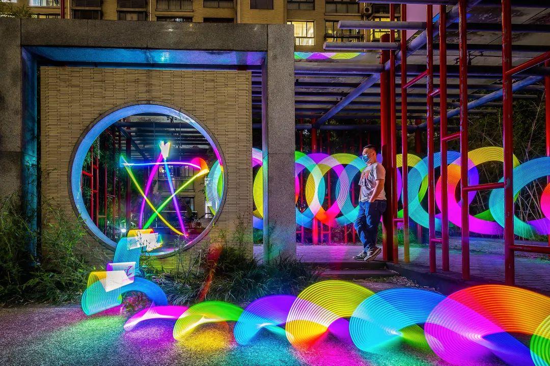 相机、三脚架、灯棒……这两天在新成路街道东润舒庭小区,总会出现一个来回奔跑、手挥荧光棒的身影。原来,这是摄影爱好者戴威廉正在进行艺术创作。与普通摄影不同,戴威廉的拍摄手法叫做光绘摄影,利用相机长曝光模式拍摄光源的移动轨迹,可形成与夜色产生强烈对比的彩色光影,极具视觉冲击力。
