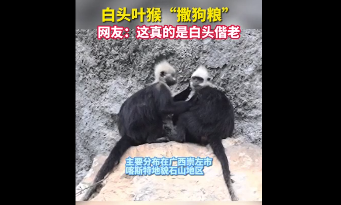 视频中的猴子其实是生活在广西崇左白头叶猴国家级自然保护区的白头叶猴,是我国特有的国家一级重点保护野生动物,数量比大熊猫还稀有。