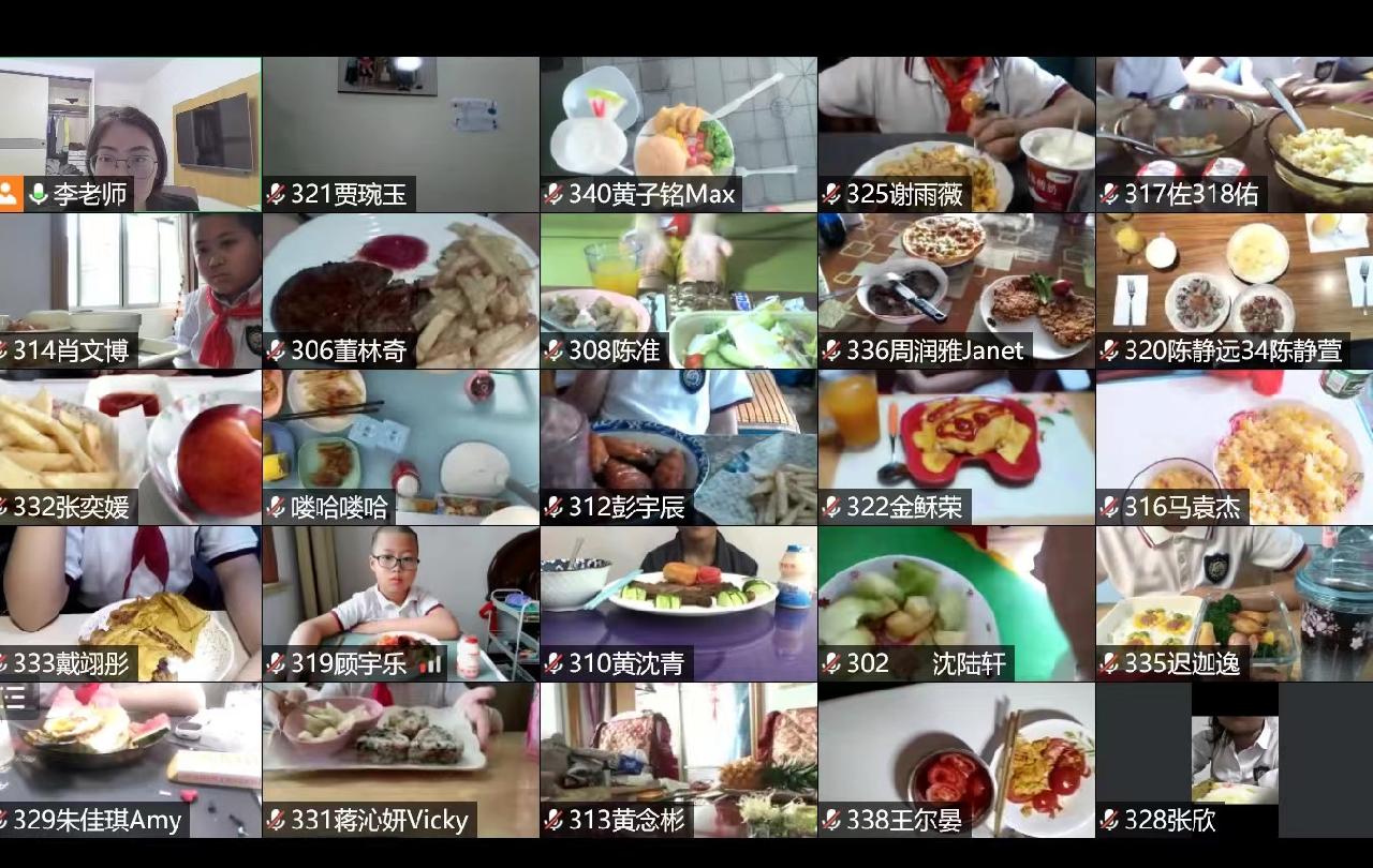 不止是周牧谦,今天对于很多九亭五小的孩子们来说,都是一个充满惊喜的日子:大家云分享自制美食,隔着屏幕,所有学生和老师唱起了生日歌,共同吃着手边美味的生日蛋糕,一起喊 “干杯”;有的孩子参加了“家庭美食PK赛”,即与家长一起制作美食,并“po”照片、视频到云端平台,其他同学们则进行投票评选,评出大家“心目中的美食家庭”;有的学生不太会制作美食,他们的导师就“云传授”“独门厨艺”,一步步教孩子们如何制作美食……