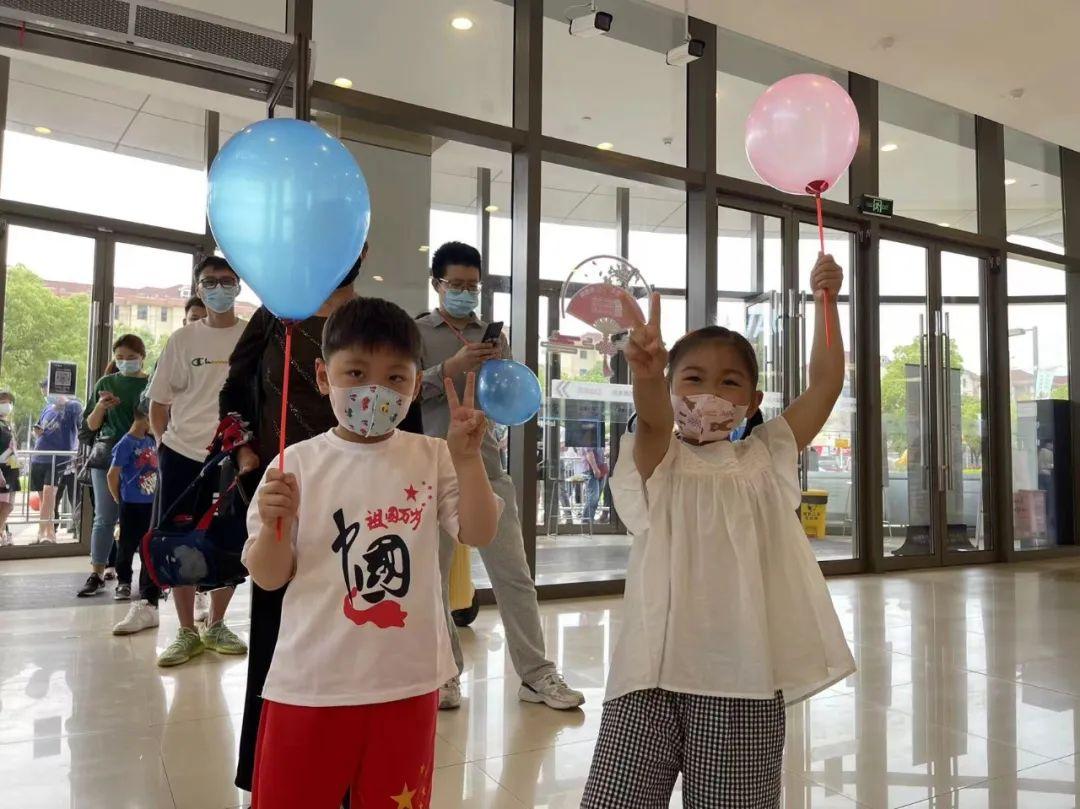 上午10点,位于宝安公路的大融城迎来了复商复市后的首批顾客。市民扫码、测温后有序进入。今天是儿童节,小朋友一进门就收到了商场赠送的气球。