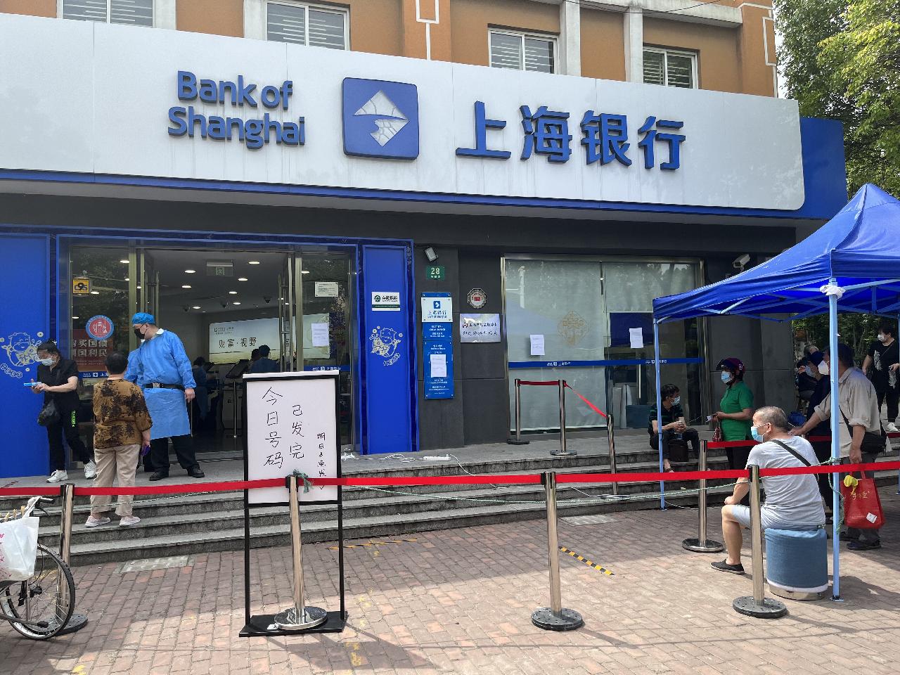 同样是居民区,普陀区大渡河路上的上海银行曹安支行门口并没有等待的老年人,原来网点提前一天就贴好了告示:“本网点6月9日因疫情管控需要停业一日。”因此,周围的老年人也没有白跑。