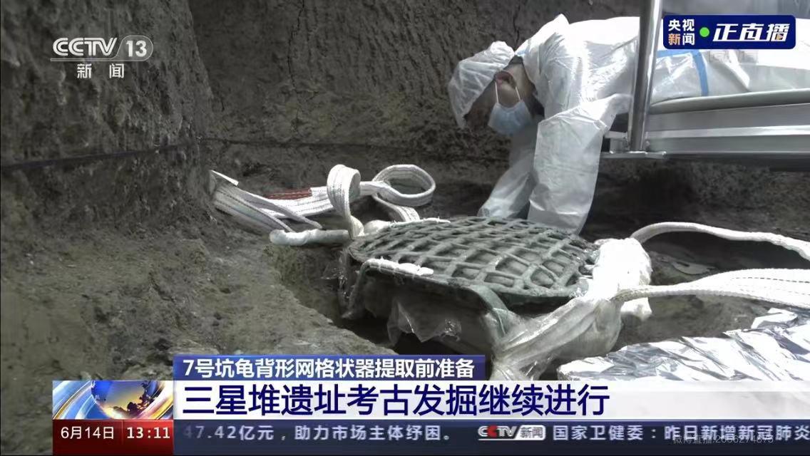 6月14日下午的直播重头戏,是三星堆遗址7号坑、8号坑的镇坑之宝“龟背形网格状器”和“青铜倒立顶尊人像”的提取出土。