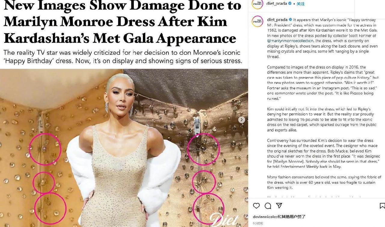 我们的金·卡戴珊觊觎这件礼服已久,多次让团队去跟博物馆借穿,最终博物馆为了热度还是答应了,但是条件是,为了确保礼服的完整,卡戴珊穿上后,必须有博物馆方面的代表在旁边监督,一旦代表觉得礼服有撕裂的危险,博物馆有权让她立刻脱下来。