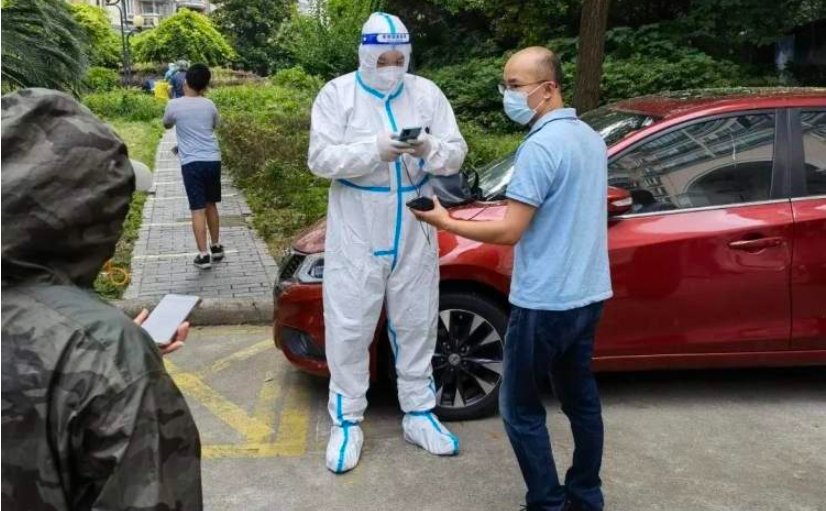 杨松龄的老搭档李明,是姚家桥居民区第五党支部书记。疫情期间,他每天身穿厚厚的防护服,背着消毒水箱,拿着大喷枪,穿梭在小区花园和各个楼栋,忙着开展日常消杀。核酸大筛时,他还要提前一个小时对各个楼栋进行加强消杀。每次作业结束后全身早已被汗水浸湿,双手也捂得发皱……