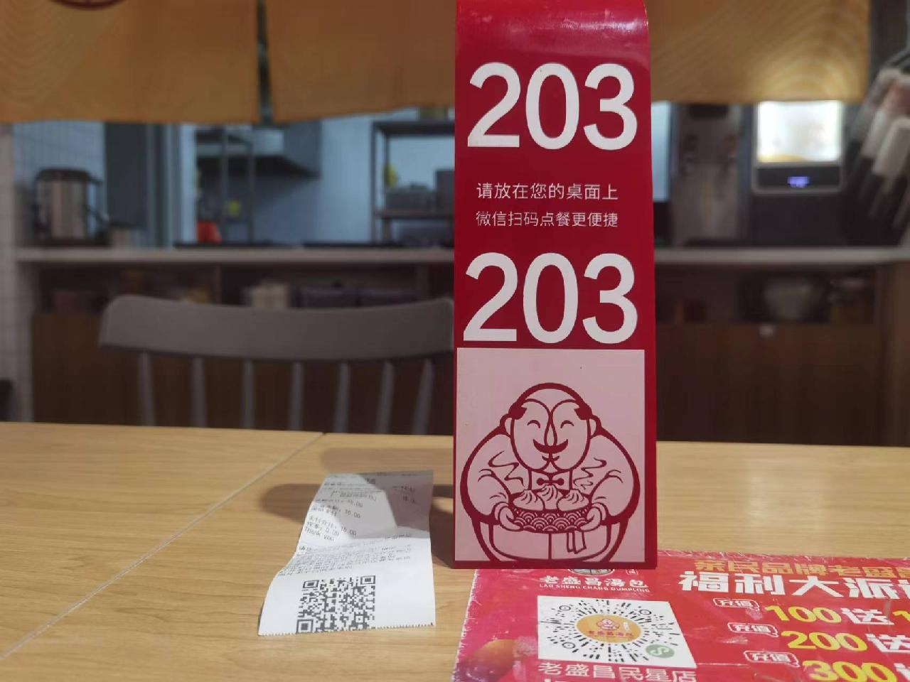 收银台的背后,墙上一大张价目表写着琳琅满目的早餐,下单后收银员问“是在店里吃吗”,得到肯定答复后,给一个塑料立式号牌、一张收银小票,无需将小票交给店员,直接入座即可。
