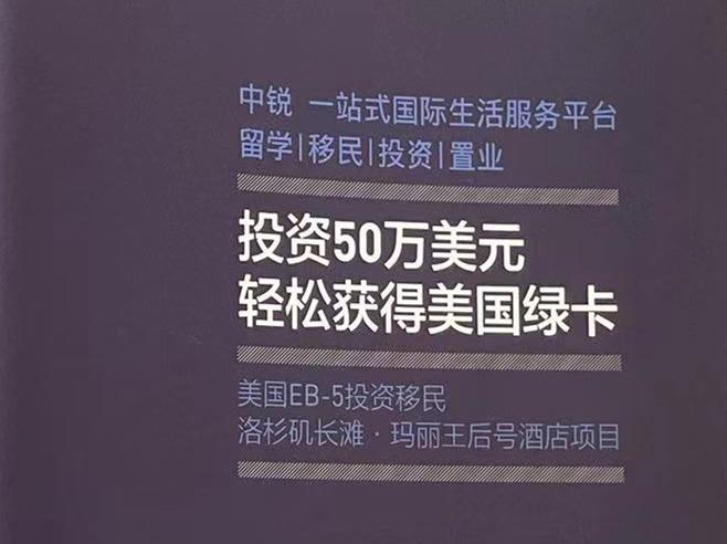 很快,明女士就从“中锐教育”拿到了一份名为《投资50万美元轻松获得美国绿卡——美国EB-5投资移民洛杉矶长滩·玛丽王后号酒店项目》的宣传册。