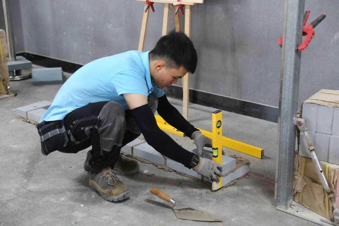 砌筑项目是指通过砌铺、垒石料、装玻璃或抹陶土等工作,用高标准的技巧和准确度,建造用于商业和居住领域的内墙、外墙、隔断、壁炉、烟囱和其他建筑物的竞赛项目。在世赛赛场上,对砌筑项目的选手而言,精度事关成败。比赛时,裁判不仅会看选手砌筑的图案与比赛要求图案是否一样,还会仔细测量墙面的误差,评判标准都是精确到毫米级。