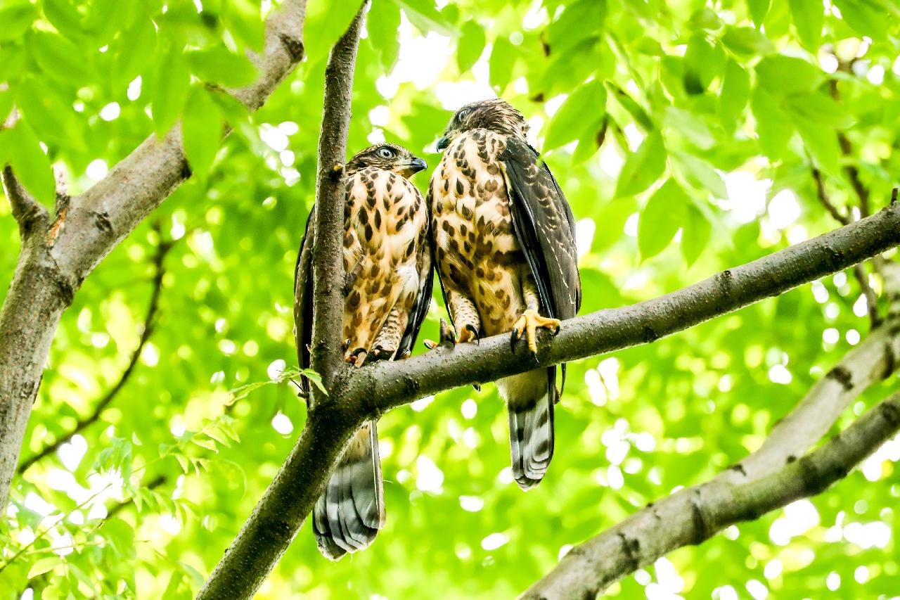 “大宁公园二只小凤头鹰已经会飞了,再不去拍就要飞走了。”这是记者朋友圈几位拍鸟爱好者这几天聊的话题。记者今天上午赶到大宁公园看看小凤头鹰,鹰巢位于公园荷花池旁香樟树林,记者用长镜头在高高的香樟林中找寻着,在离鸟巢不远的香樟树上发现两只幼鸟站立枝头,看起来都很精神。