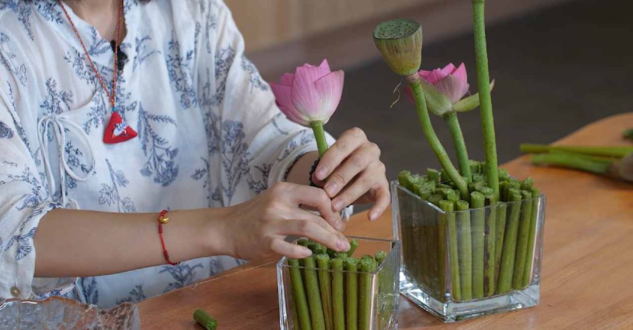 花材:3朵大小不等的荷花,2支莲蓬,2片荷叶。