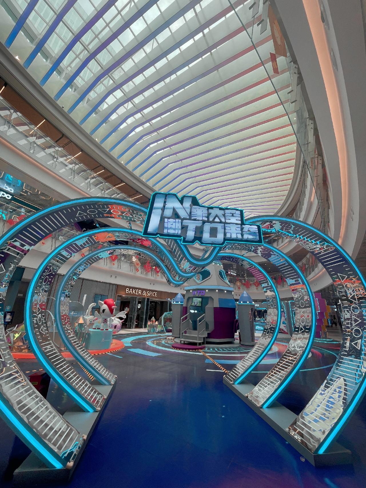 作为上海漕河泾印象城一周年庆系列主题活动的开幕主题展,将商场原创IP形象 INTO与同样具有机械属性的潮流IP形象tokidoki进行深度联动,INTO的标志性外观与独角兽形象相结合,为tokidoki换上了极具科技感的粉蓝色新装,并将全新配色沿用融合至整个主题展场景中,带来别具一格的潮流视觉冲击。
