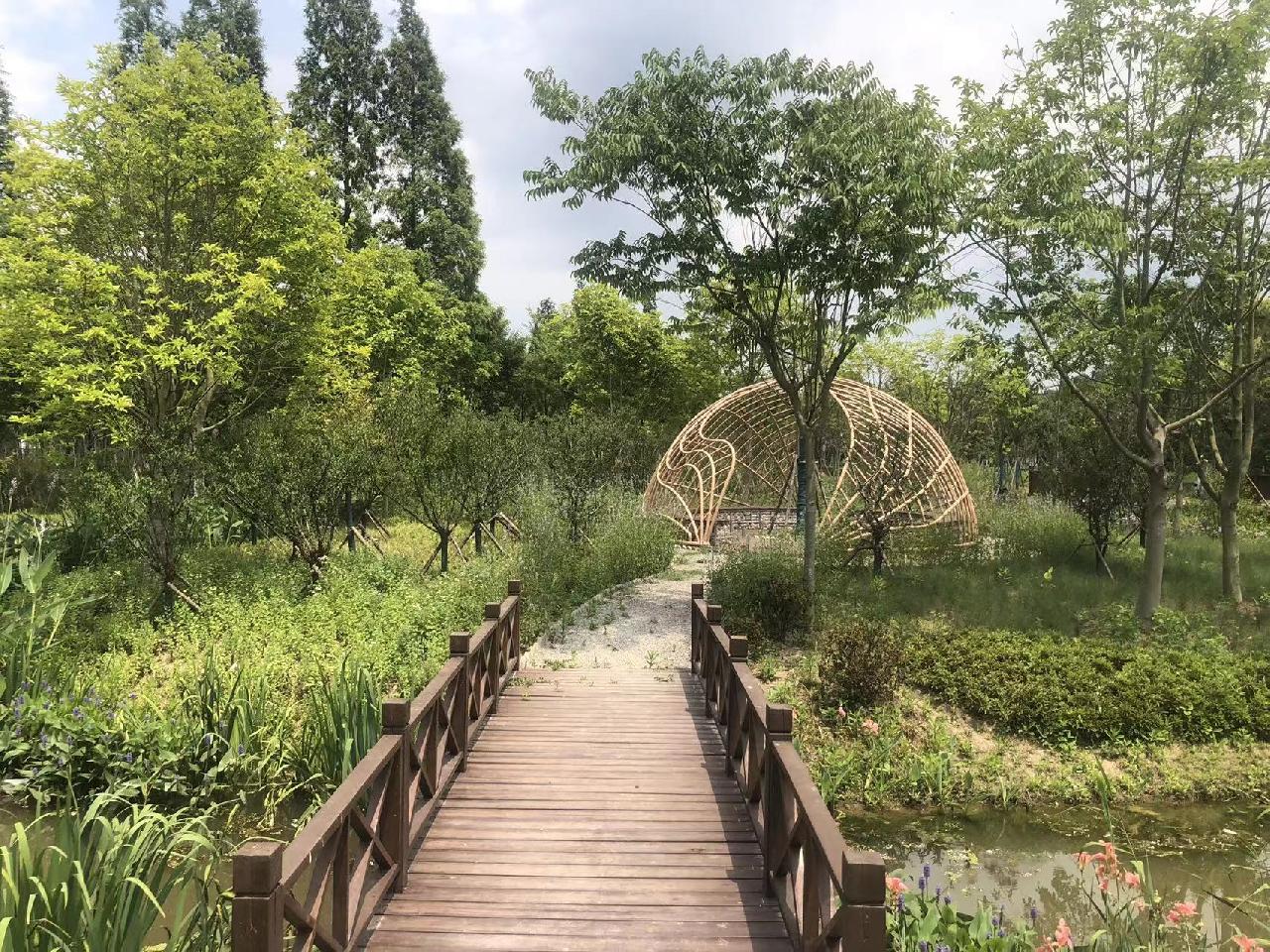 2.青浦青西郊野公园周边开放休闲林地:位于青西郊野公园东北侧,周边有河祝村、南尤浜、北尤浜三个行政村,周边水系丰富。分观鸟科普区、萍开蛙鸣区和入口景观区三个主题分区,打造季相变化丰富的生态森林,满足市民休闲、游憩和健身需求。