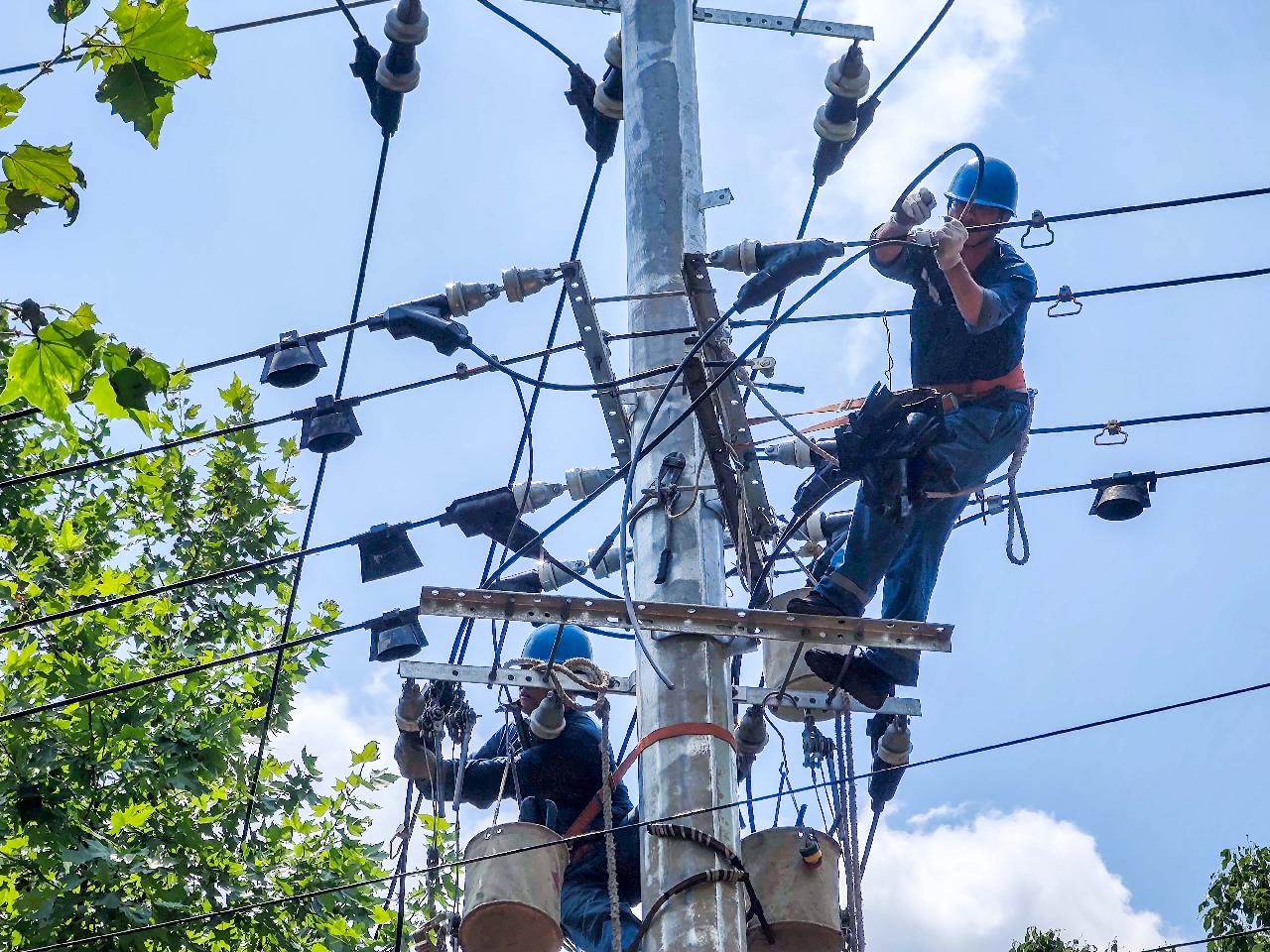 换电杆、拉线、装金具、调整弧垂度……气温逐渐攀升,工人们的工作服早已经湿透,但他们并没有停下手中的工作。11:30左右,抢修顺利完成,工人们这才稍微喘口气,喝口水。