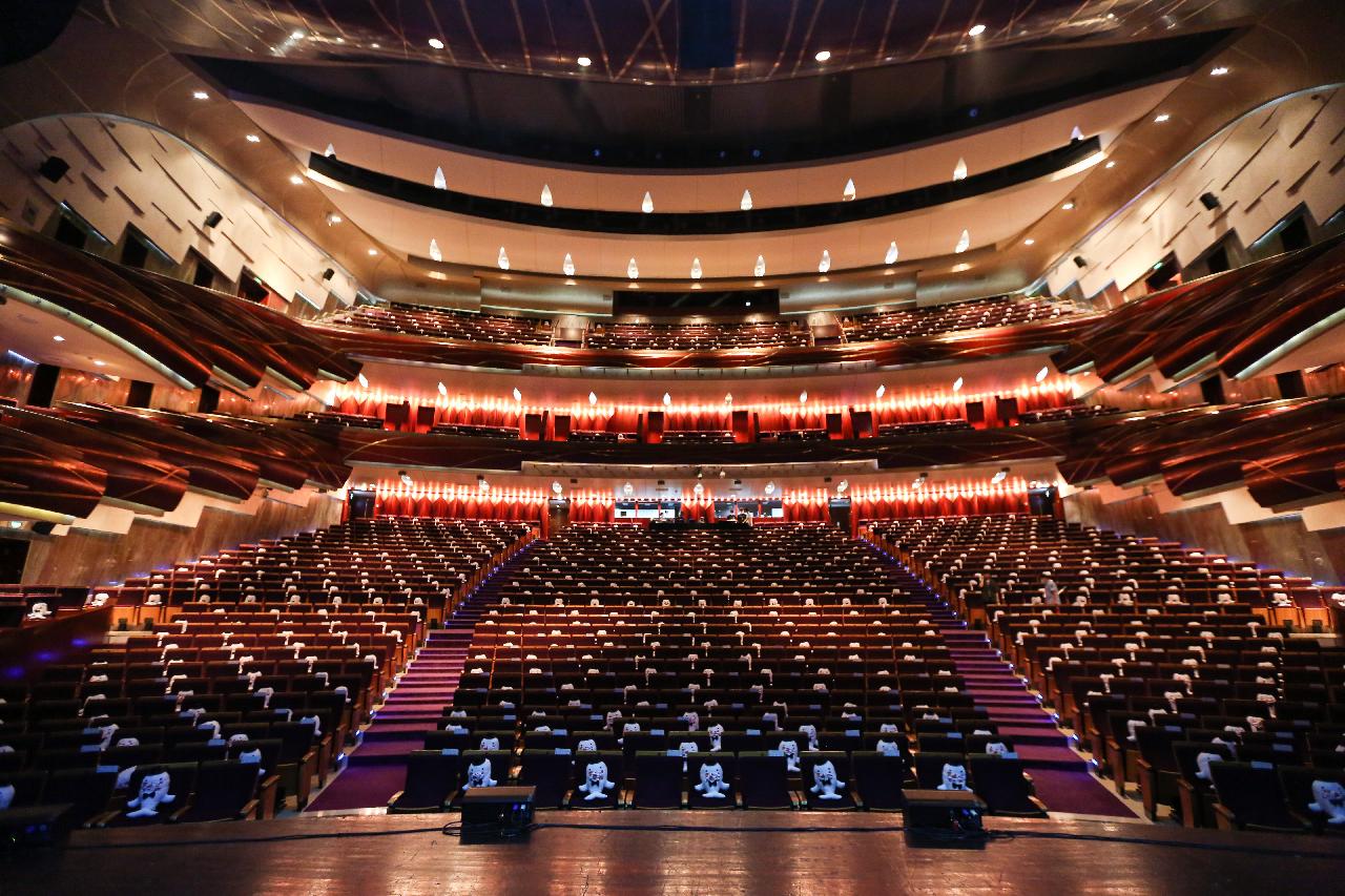 虽然首演票已经全部售罄,但为了严格控制50%上座率,观众厅依然略显空旷。剧院贴心地隔座放置了极具亲和力的“广场小白”公仔,成为当晚的一大亮点。