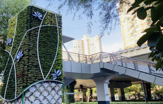 “在项目设计之初,我们考虑到天桥西侧电梯正对着玉兰园,因此选择了‘玉兰藏春’为绿化主题,电梯外立面的垂直绿化以玉兰树造型进行装饰,用LED灯带在绿植中勾勒出一朵玉兰花,与主桥两侧玉兰花灯箱相呼应。“