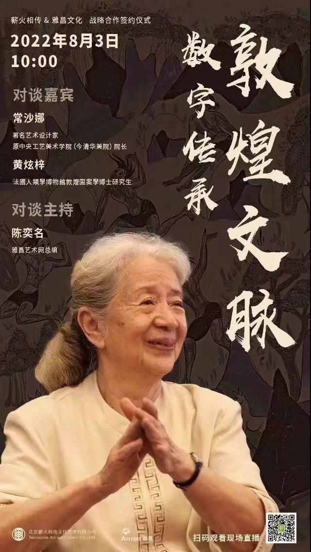 2022年8月3日,著名艺术设计家、原中央工艺美术学院(今清华美院)院长常沙娜先生及其团队“薪火相传”与雅昌文化集团进行战略合作签约。同时,常沙娜先生、法国人类学博物馆敦煌图案学博士研究生黄炫梓及雅昌艺术网总编陈奕名展开一场艺术对谈直播。