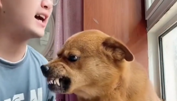 视频中,博主“小胖科学家”对着窗台上的小狗唱歌,但小狗却对其表现出极其抗拒的状态,甚至对其呲牙,并时不时狂吠。