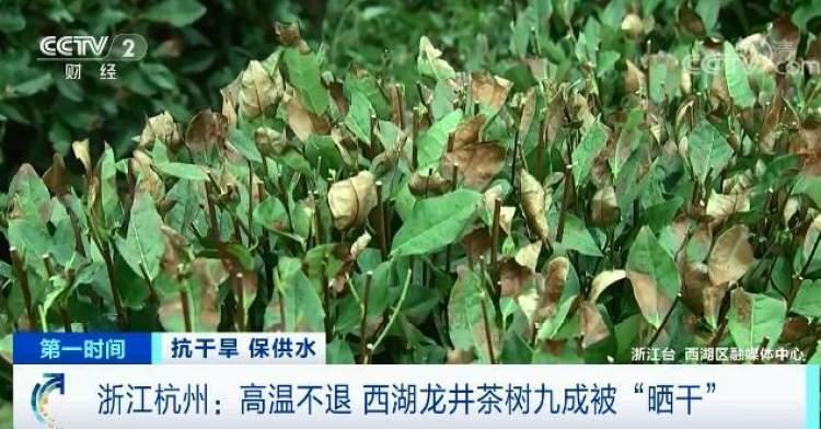 持续的高温让西湖龙井茶树出现连片的焦黄、卷曲,茶农告诉记者,茶树最适合生长的温度是10-25摄氏度,连续的强光照射、高温干旱8-10天,茶树就会出现日灼病。