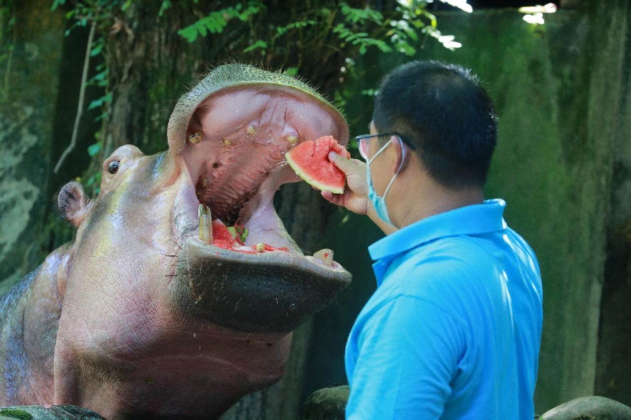 饲养员根据不同动物的自然习性和个体情况,按照适量原则,给动物们的夏季食谱增加西瓜这一多汁饲料。其中,“费瓜”TOP1当属河马。