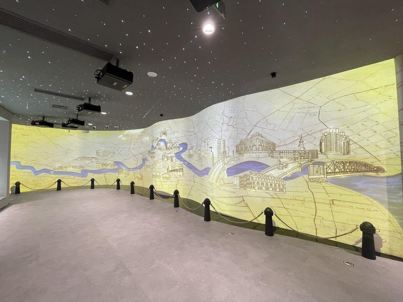 在一楼展厅,一幅老上海工业的“清明上河图”长卷徐徐延展开来,结合交互技术,参观者们可以跟随投影,从外白渡桥沿着苏州河溯流而上,饱览苏州河沿岸的重要建筑、工厂、航运以及道路风光,身临其境地感受20世纪二三十年代苏州河两岸工业林立、商业繁荣的景象。
