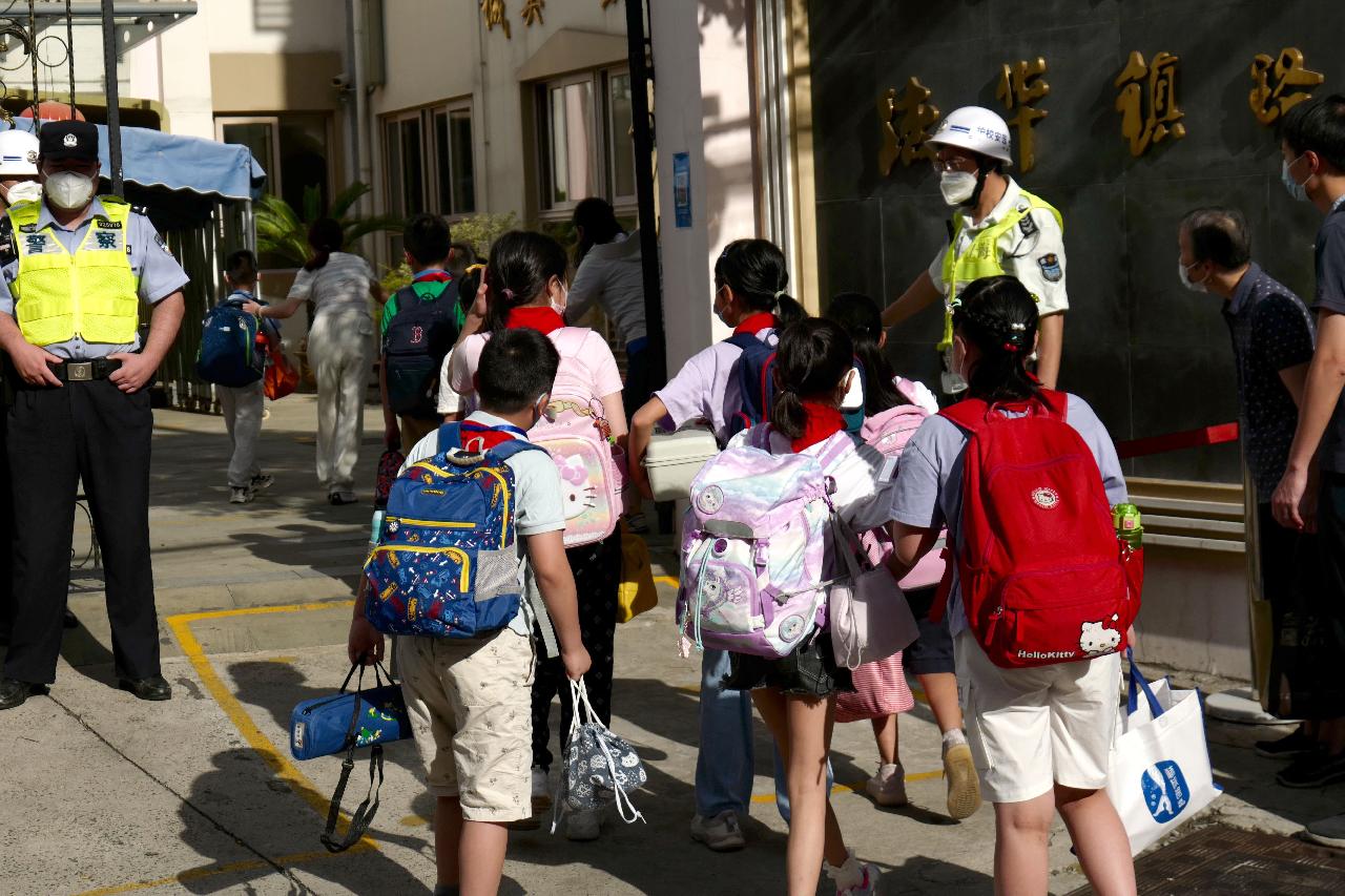 今天,是上海中小学新学期开学的日子,各校门口也热闹了起来。早上7:30,记者在法华镇路第三小学看到,陆续到校的小学生们在体温测量区测温后,有序进入校园,送学的家长们也相互打招呼“终于开学啦!”