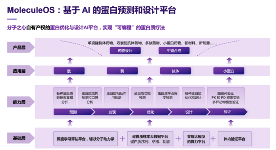 MoleculeOS具备蛋白质结构及特性预测和蛋白质设计能力,在蛋白质从头设计、蛋白质优化、抗体重设计、蛋白质以及复合物结构预测、蛋白-蛋白对接、蛋白质侧链预测、蛋白质功能预测、蛋白质语言模型等关键算法和模块方面,目前已开发出十余项世界领先的 AI 算法,计算结果远超文献报道及全世界已公开发表的最好结果。