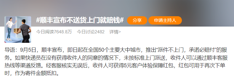 #顺丰宣布不送货上门就赔钱#登上微博热搜!原来顺丰称,派件不上门,承诺必赔付”的承诺。
