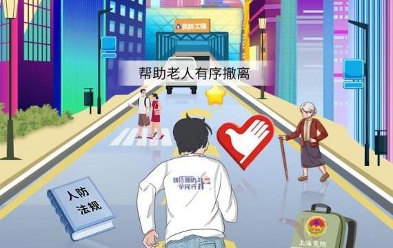 为生动展现“鸣、走、藏、消”全过程,小游戏各环节融入了丰富的民防知识点。例如呈现三种警报声音;听到预先警报后带上应急物品、关闭水电煤,向民防工程迅速撤离;利用随申办APP中的“民防地图”找寻身边的民防工程;在民防工程内部要听从工作人员指挥;解除空袭警报后消除空袭后果等。