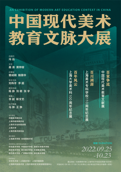 为纪念上海大学建校100周年、上海美术专科学校建校110周年、上海大学美术科创立100周年,由中国美术家协会、上海市教育委员会、上海市文化和旅游局、上海大学、上海市美术家协会主办,上海美术学院、刘海粟美术馆承办的“中国现代美术教育文脉大展”2022年9月25日至10月23日在刘海粟美术馆举行。