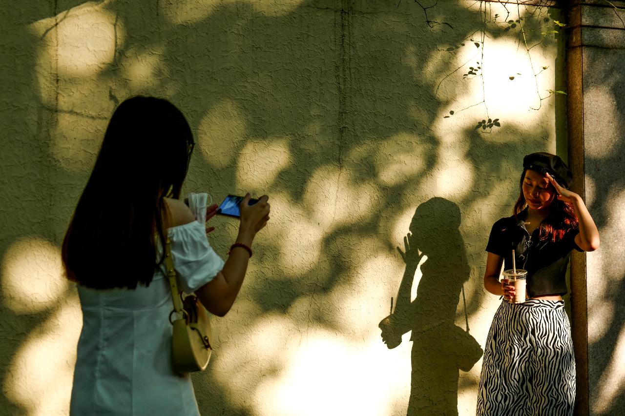 午后3点多,阳光穿过梧桐树叶,落在墙上留下一片斑驳的光影。斑斑树影的光影特效一下子吸引了小姐姐们摆pose。