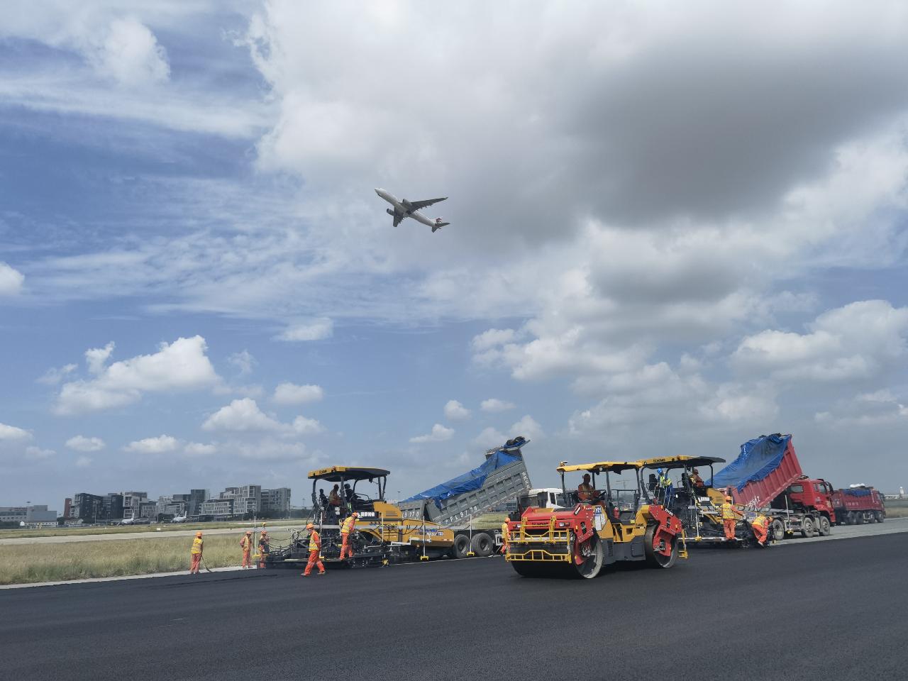 据介绍,此次使用的摊铺材料与常规道路用沥青材料相比,抗车辙、抗疲劳、抗高温性能更加优质,针对飞机起降、平滑等特性,可满足机场道面重载、高速、频繁加减速的行驶特征,提高跑道的使用性能及使用寿命。