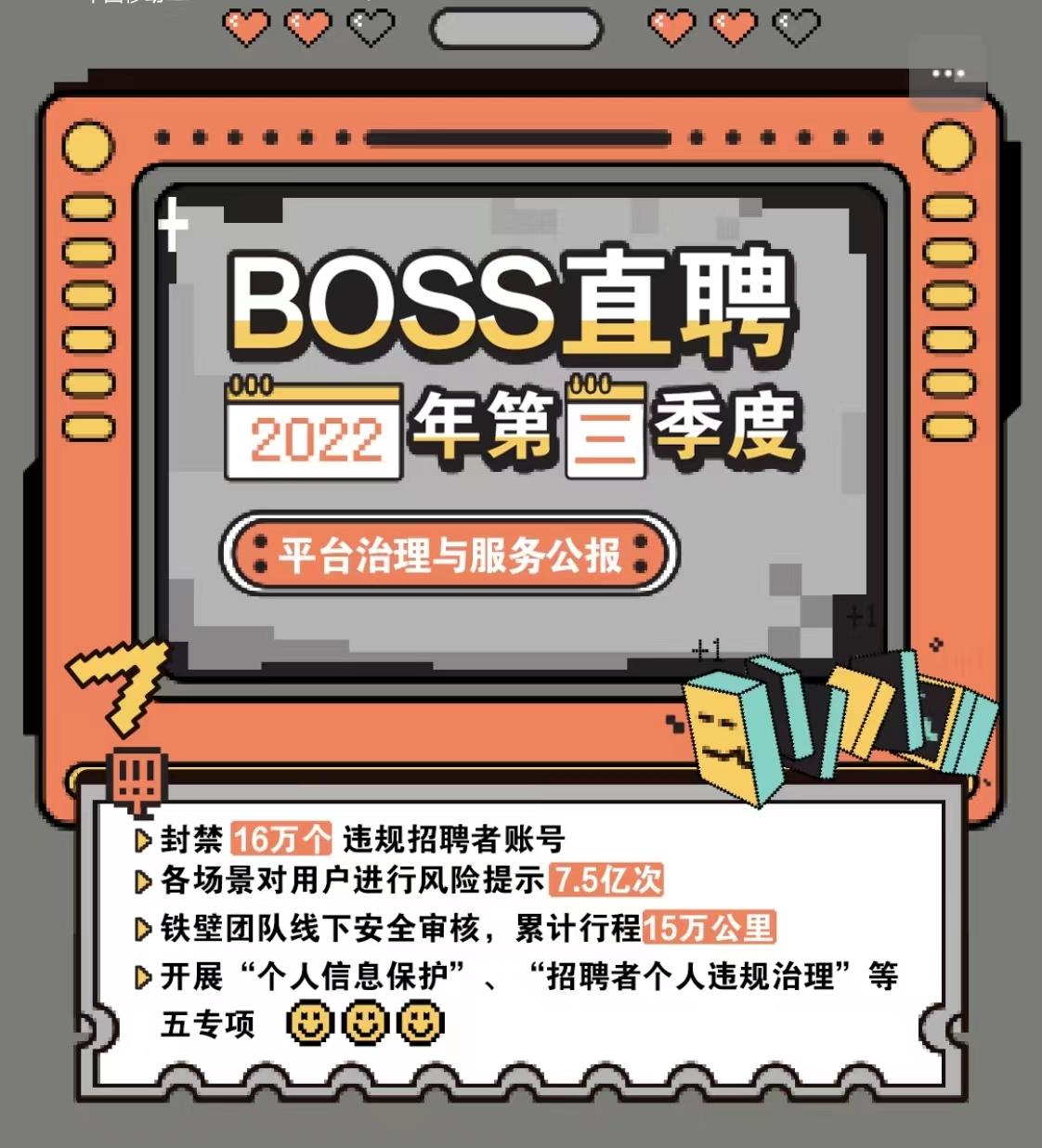 2022年10月26日,BOSS直聘发布《第三季度平台治理与服务公报》(以下简称《公报》),三季度BOSS直聘强化对求职者的安全教育,平台系统主动下发、推送求职安全风险提示、反诈科普知识、文明沟通类用户教育等内容累计达7.5亿次。季度内,共封禁16万个违规招聘者账号。