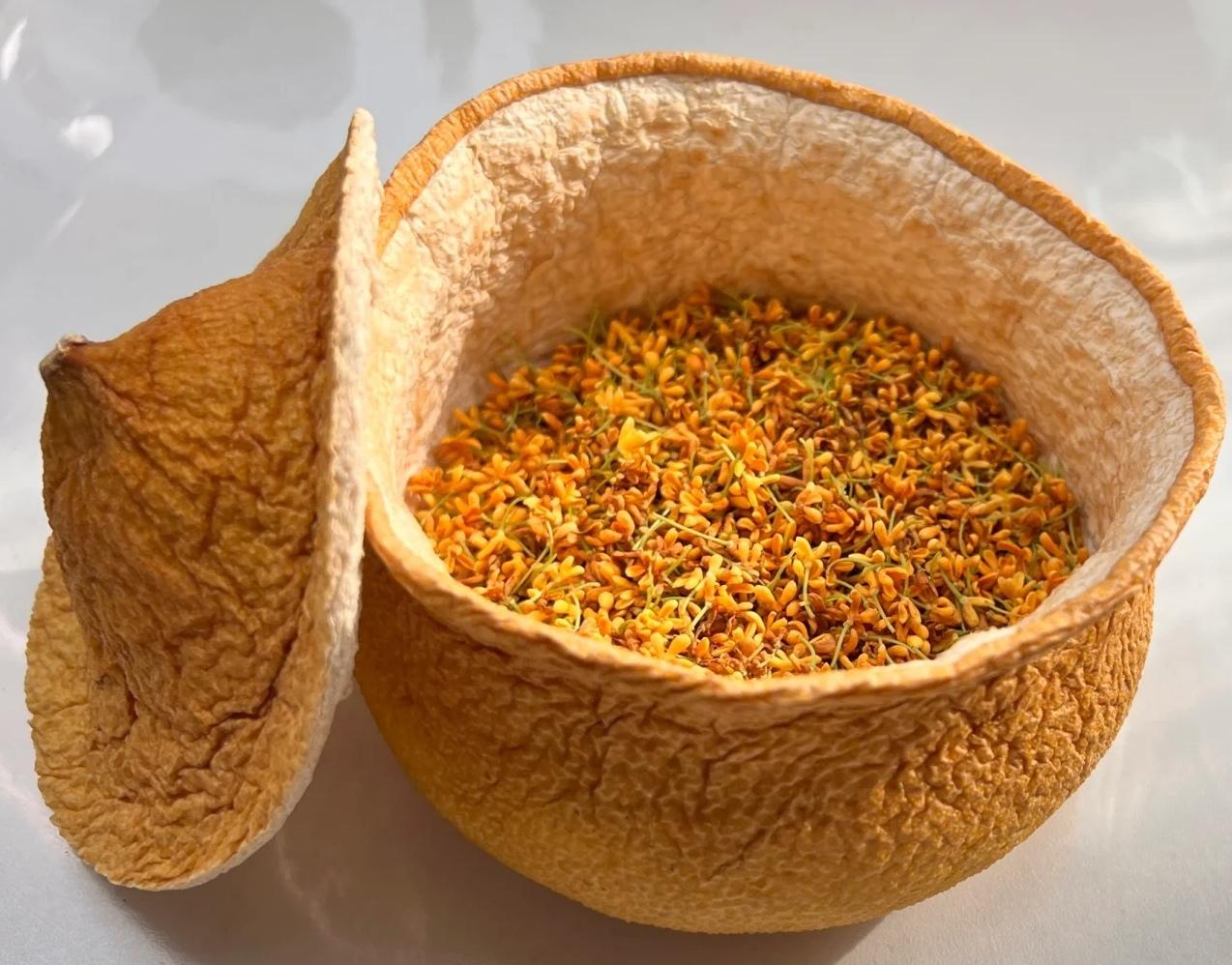 很多网友不约而同有“果皮罐子装花草种子”的思路。除了茶叶以外,有网友用柚子罐装瓜子花生当做零食罐,也有人用它来装新鲜的桂花,做成很有艺术美的小香罐。桂花凋落的季节,趁天气好收集一些在柚子罐里留住金秋味道,实在是太搭了!