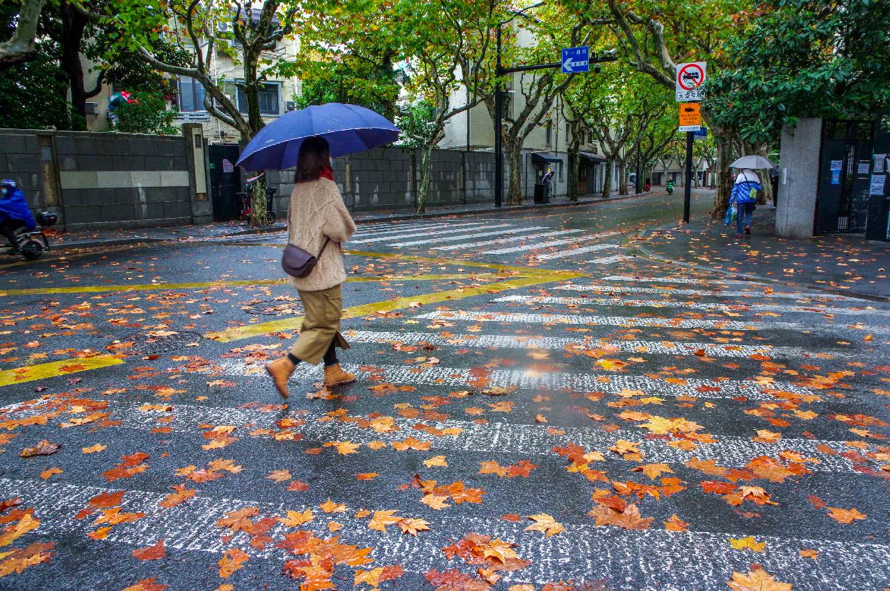 今天的申城,秋雨淅淅沥沥的下了一整天,色彩斑斓的树叶被雨水打落,落叶铺满了街面。