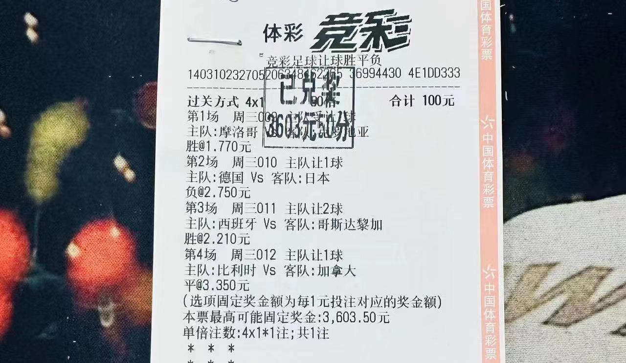 众所周知,这种过关4串1,必须4场全部命中才能中奖,难度相当大,这位购彩者合计投入100元,结果全部命中,擒入奖金3603.5元。
