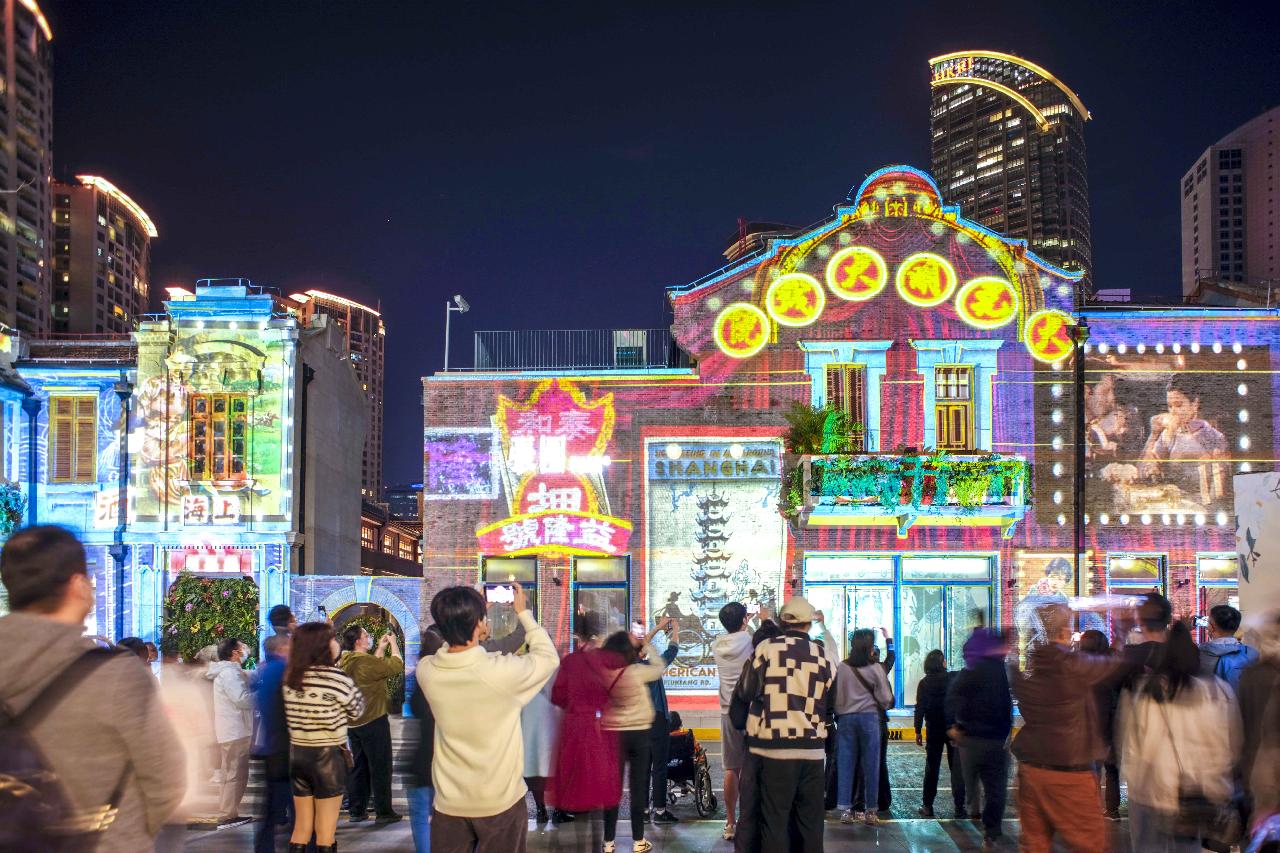 11月27日,上海城市更新项目张园正式焕新揭幕。晚上6:00茂名北路上演石库门灯光秀,借助张园石库门建筑的外立面,叙述张园的故事。