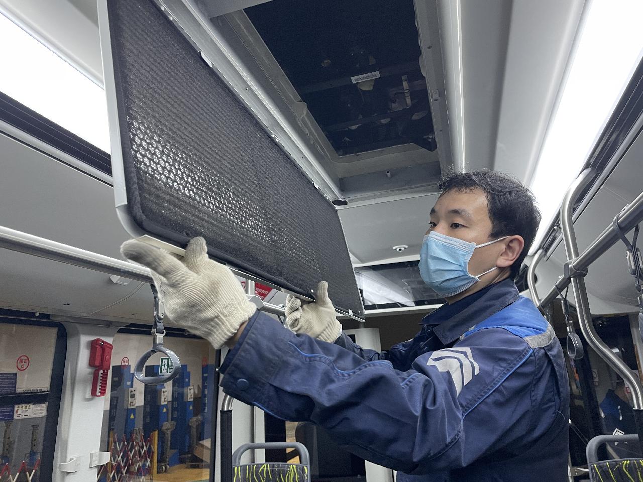 今天上午,在巴士一公司的修理车间作业区,工作人员左成晨正严格按照工艺要求进行暖空调保养。他认真地对车厢内部空调出风口及过滤网罩进行清洁。对公交车顶冷凝器、蒸发器部件进行维护,仔细检查高压电器系统、各类风机的运转情况,做到发现故障及时修复。