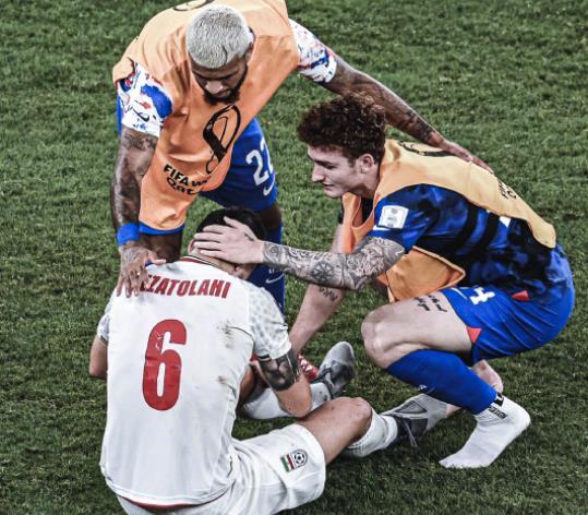 伊朗0比1不敌美国队之战,虽然两国关系紧张,但在伊朗队被淘汰后,美国队员向伊朗球员表示了安慰,足球在这一刻尽显温情。