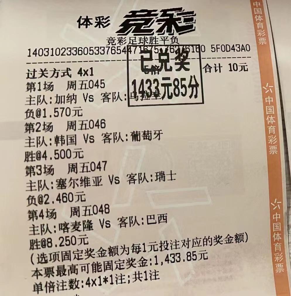 浦东新园路98弄65号的体彩12763网点再次中出神单。先来看第一张:这张竞彩投注单进行4串1过关投注,清一色选择竞彩足球胜平负。第一加纳VS乌拉圭,这位彩民选的是主负;第二场韩国VS葡萄牙,选主胜;第三场塞尔维亚VS瑞士,选主负;第四场喀麦隆VS巴西,选主胜。单注2元,进行5倍投注,总投入10元。结果这4场比赛全部打出理想中的结果,累计奖金1433.85元,回报率高达143倍!