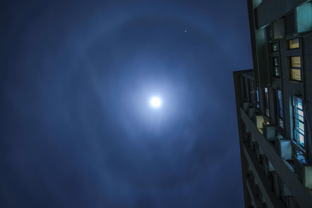 22点30分许,记者抬头发现朦胧的月亮周围出现了一个巨大的圆环,非常完整,光环围绕着月亮,极其梦幻。