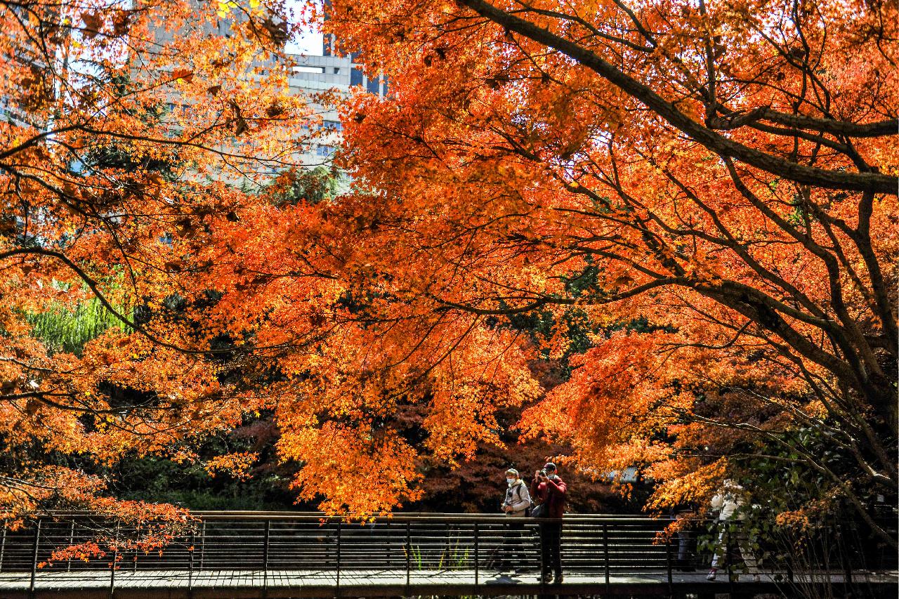 靠近黄陂南路的木栈桥边数棵鸡爪槭已由黄到红,呈现出它最绚丽多彩的色彩,令人心醉。