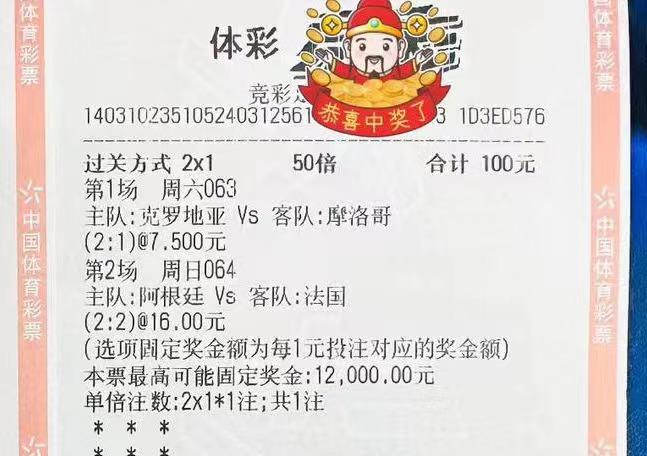 第一场克罗地亚VS摩洛哥,这位彩民单挑2:1;第二场阿根廷VS法国,又单挑2:2。单注2元,进行50倍投注,总投入100元,可获得固定奖金12000元。