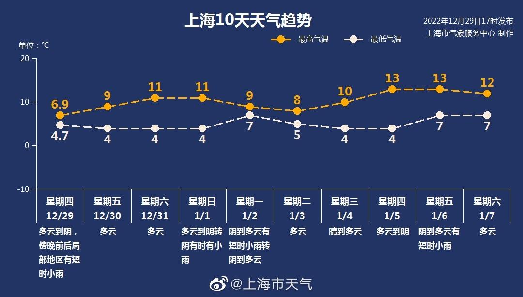 据@上海市天气 ,12月31日,上海在多云的好天气中跨年,气温在4~11℃之间,东北风3~4级。1月1日至2日冷暖空气交汇,夜里至2日白天有次小雨和降温过程。这两天气温在4~11℃之间。3日起将有3天晴或多云的好天气,3日短暂降温后,气温有逐日回升的趋势。过去十天和未来十天对比,气温由偏低转为偏高。